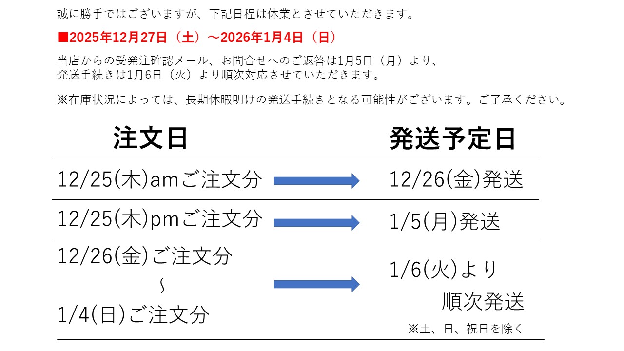 2025年12月25日(木)pm以降のご注文に関しましては、2026年1月6日(火)以降の発送になります。